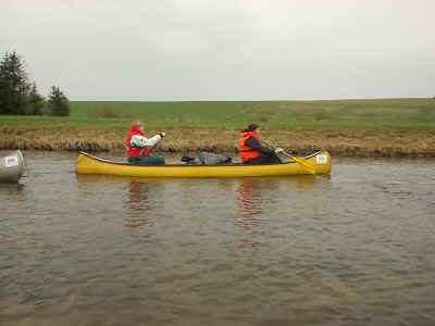 Lørdag: Den nye dag er oprandt, og der bliver spist en hurtig omgang morgenmad, og så af sted til åen. Vi har desværre ikke haft vejrguderne på vores side, da det har vist sig at blive køligt og blæsende hele weekenden, men er vi spejdere eller ej? Dette spørgsmål kunne ingen af os svarer på, men vi blev enige om at det er man vist, hvis man bruger en hel weekend på at sejle i kano i skodvejr. Det helt store spørgsmål var stadig om vi kunne krydse den foreliggende sø i sikker stil, da vejret stadig var noget uregelmæssigt. Det viste sig heldigvis ikke at være noget problem med en hel flok af ”stærke”, og ”styrer sikre” spejdere. Der blev holdt en kort pause med frokost, og tilhørende hvil (hvilket jeg er sikker på at mange var glade for). Efter ca. 8 timers sejlads nåede vi til vores udpegede overnatningssted, selvom vi var lidt uenige om det var det rigtige sted. Så blev der slået telt op, vasket kanoer, og nogen startede på maden. Menuen stod på grillede svendepølser m. grillede pølse- brød. Dette var et måltid mange var glade for, selvom jeg tvivler lidt på dets kulinariske værdi. Resten af aftenen stod det på hygge om et ny anskaffet lejrbål, og andre sociale ting. Som eks. aftentur på åen hvilket de tre store drenge: Jakob, Niels og Morten benyttede sig af. |