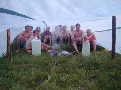 Man kan også gå i sauna. Her er det en sauna bygget af en presenning. Presenningen gøres fast til jorden hele vejen rundt. Midten hæves så man kan sidde derinde. Nogle store sten er i mellemtiden opvarmet i et godt bål og bæres nu ind i sausaen. Man kan selvfølgelig hælde vand på stenene. Husk bare, at man ikke må bruge flintesten da de springer.