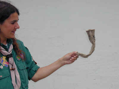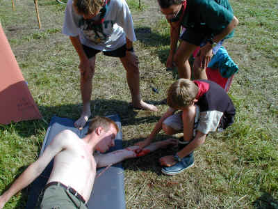 En ting som spejderne lærer er førstehjælp. Dette skal naturligvis også afprøves på aktiviteter og her er en af spejdertroppens ledere "offer". Her er det en pulsåreblødning som spejderne lige er ankommet til. (PS.: Blodet er kunstigt).