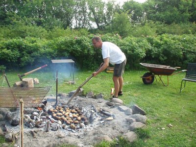 Efter dagens strabadser skal det gøre godt med noget grillmad - menuen stod på bålkartofler, grillkyllinger og grøn salat.